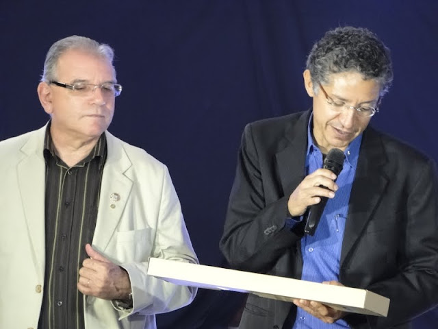 mãos do Secretário de Cultura de Araçatuba, prof. Hélio Consolaro, da secretária de Assistência Social Cidinha Lacerda, do presidente da